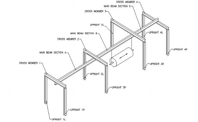 Able Lifting Equipment had a requirement for stress analysis be carried out on a structure used for transporting a paper roll along a runway beam. The structure consisted of a 15 metre long main runway beam, which is supported by 4 sets of uprights. The existing structure was used to transport a 3.6 tonne load which would run along the beam using a pair chain blocks suspended from beam trolleys which are 2.75 metres apart. The complete structure was to be uprated to support a total load of 5 tonnes, shared between the two lift points.